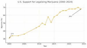 Marijuana legalization has had an upward trend for decades now. Here’s a graph charting its trajectory, according to Gallup polls from each year back to 2000. We may have hit peak acceptance, but if Trump signals support, the numbers can keep going higher.