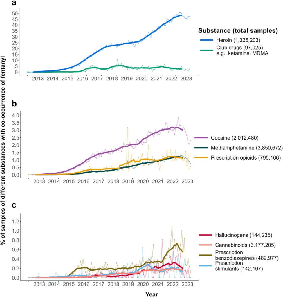This doesn’t mean there was no trace of fentanyl throughout. Of the samples, they found about half of their heroin contained fentanyl and a small uptick of fentanyl found in methamphetamine and cocaine (up to about 4% of samples starting in 2017) since the study began.