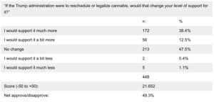 However, if he were to change marijuana to Schedule III, that 51% of them would change their mind about his actions. This is sort of obvious, considering he hasn’t done anything at all towards reform since he’s been in office, but still shows much public opinion could sway after these actions.